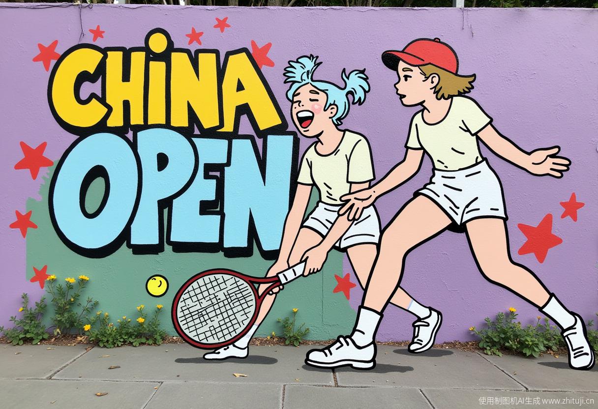 Vibrant graffiti wall, two female tennis players are playing tennis, with the text "China Open", stylized tags, bold and colorful lettering, energetic atmosphere