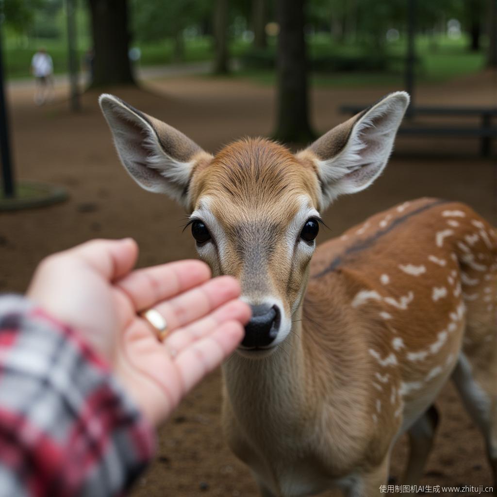 一张在宠物动物园里,孩子伸出手去抚摸好奇的小鹿的自然照片。小鹿的鼻子在向手移动的过程中略有模糊,营造出一种动感。