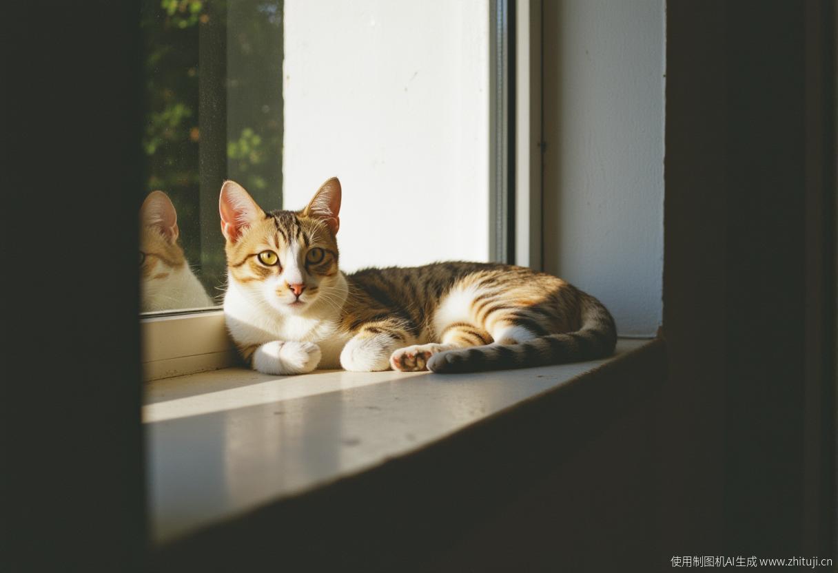 A tabby cat lounging on a sun-dappled windowsill, half its body in shadow, half in bright light