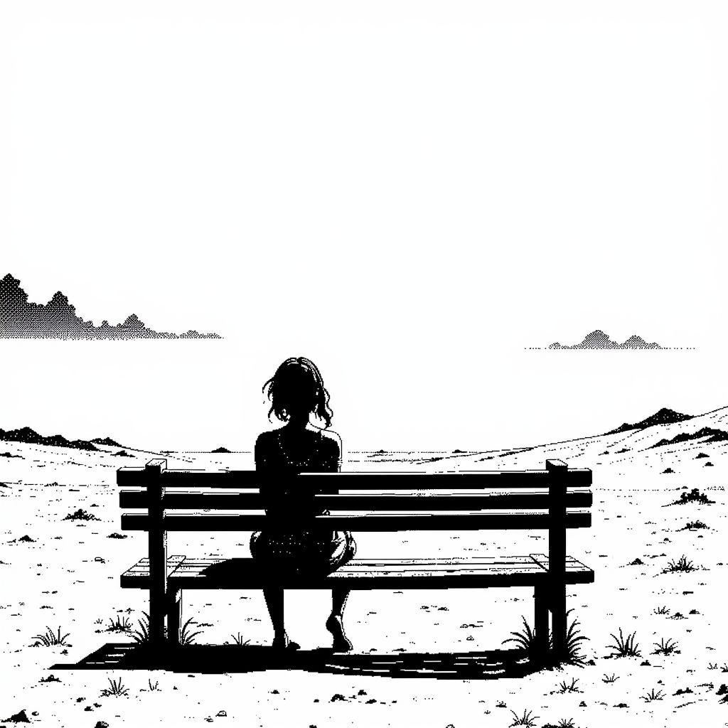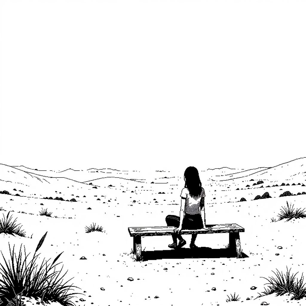 a woman sitting on a bench in the desert, sand dunes