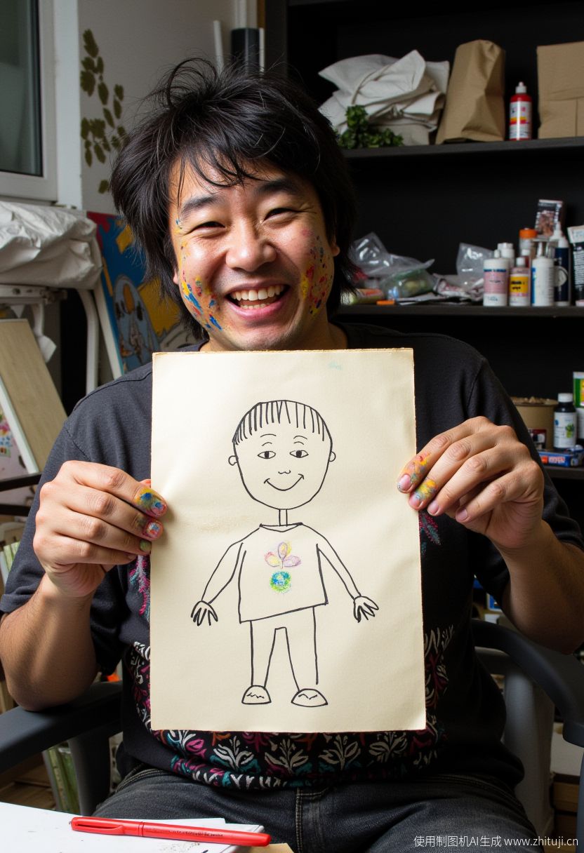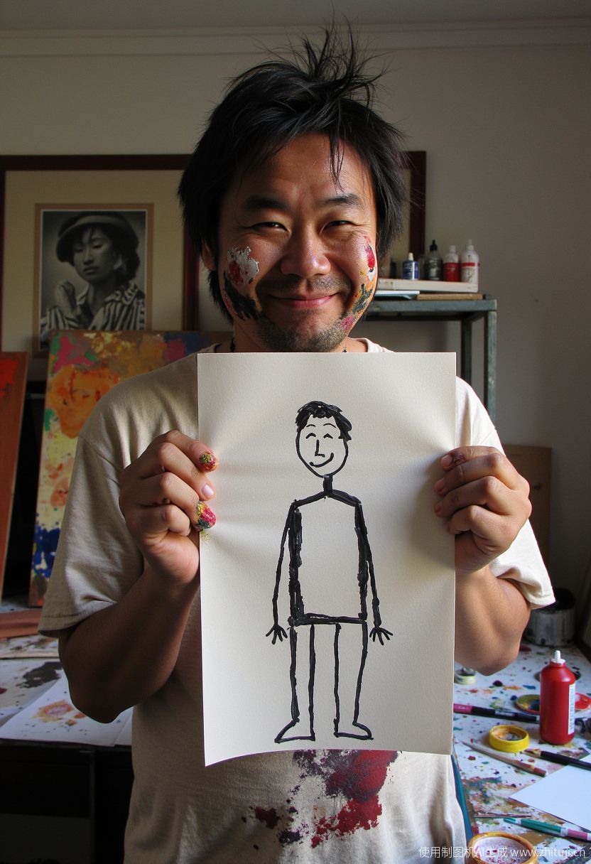 In a close-up shot inside a messy artist's studio, a slightly unhinged-looking Chinese guy in his late 30s, with wild hair and paint splattered all over his face and shirt, holds up a piece of paper proudly. He is grinning likehe has just solved a life mystery, showing off his "masterpiece" with pure, chaotic joy. The paper reads: "Since SD 3.5 Large cannot draw me, I drew myself using Flux!" The self-portrait is a stick figure that looks like a child's scribble, but the man's expression says he genuinely believes it's a masterpiece. Behind him, paint tubes and half-finished canvases are scattered everywhere, adding to the creative madness of the scene