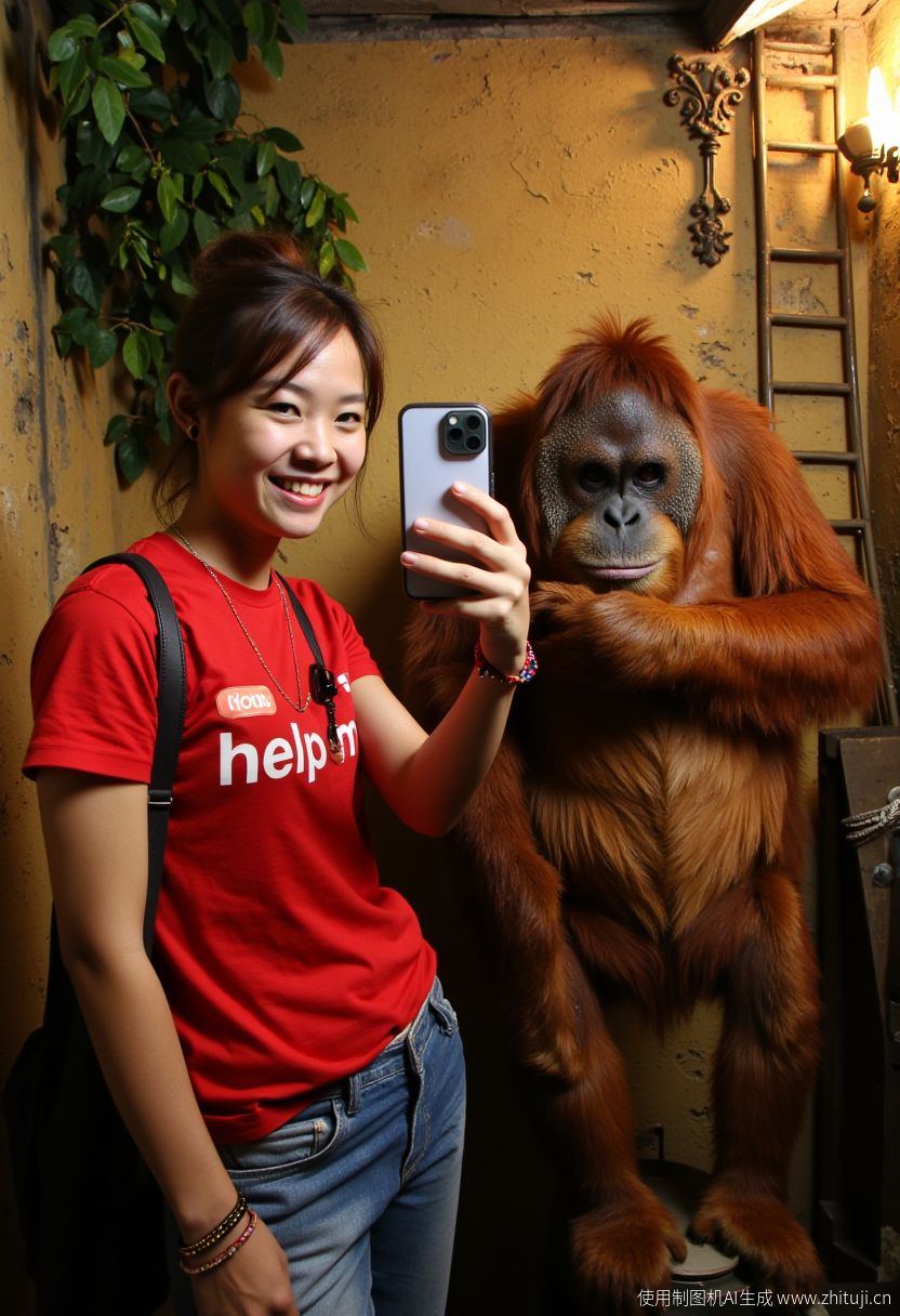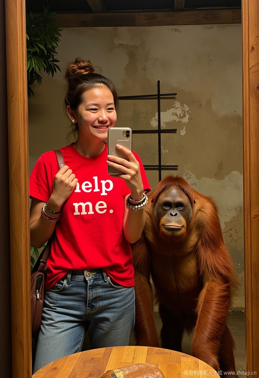 A medium shot selfie photo featuring a young Chinese woman and an orangutan, with indoor artificial lighting and a rustic setting captured in clear detail; the image features a warm color palette. The young woman, of Caucasian descent, has a fair skin tone with visible pores and natural texture, and her brown hair is tied back into a neat bun. She has a relaxed expression, smiling slightly as she takes the selfie with her phone, which is visible in the foreground of the mirror reflection. She wears a red shirt with the text "help me", and blue jeans, accessorized with bracelets and a small handbag slung over her shoulder. Standing beside her is an orangutan, slightly shorter in height with characteristic reddish-brown fur, standing comfortably with its gaze directed at the camera. The orangutan's expression is calm. The background shows an old, textured wall with a ladder-like decoration and some lush greenery. The warm artificial lighting adds depth to the scene, emphasizing the rough