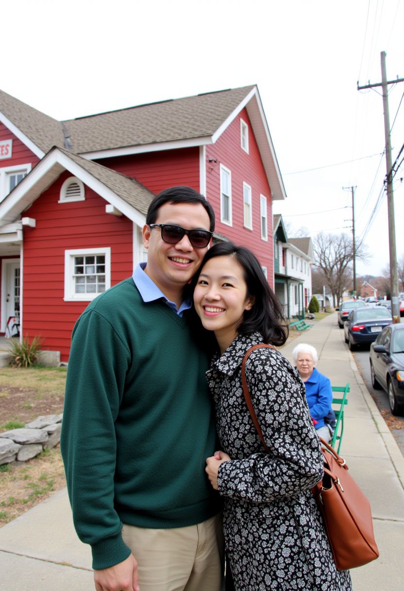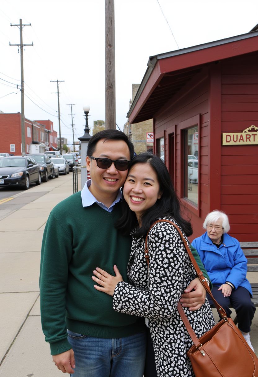 Medium shot photo of a cheerful Chinese couple standing close together in an outdoor setting, showcasing a warm and candid moment. The man, with a round face, and short hair, is wearing dark sunglasses and a green sweater over a blue collared shirt. He has a wide, joyful smile, and his left arm is wrapped around the woman, adding to the affectionate pose. The woman, with light skin and shoulder-length wavy black hair, is smiling broadly as she leans into the man's embrace. She is wearing a black and white patterned coat and carries a brown handbag over her shoulder. In the background, a quaint small-town setting is visible, featuring a red wooden building with a visible sign reading "DUARTE'S," as well as parked cars and power lines. A woman with white hair, dressed in a bright blue jacket, sits on a bench by the building, adding a casual, lived-in aspect to the scene. The lighting is natural, indicating a bright but slightly overcast day, which gives the image a relaxed, everyday qual